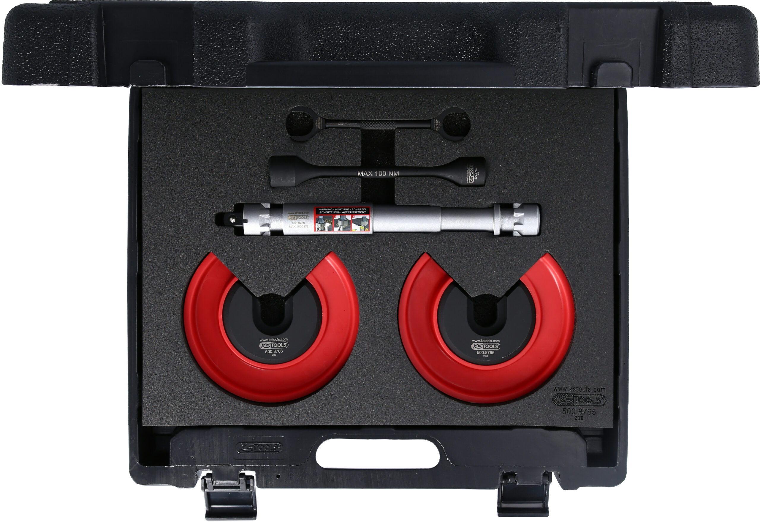 Ein Sicherungselement sorgt für die seitliche Fixierung des Federtellers. Ein Torsions-Antriebselement macht diesen Federspanner noch sicherer. Weil er mit einem Drehmoment funktioniert, das maximal 100 Newtonmeter zulässt, ist das Werkzeug vor einer Überlast wirksam geschützt. Besonders geeignet ist der Teleskop-Centerspanner-Satz für Fahrzeuge mit sehr kleinen Zugangsbohrungen, besonders für Audi A4 B7 (8E), A4 B8 (8K), A5 (8T), A6 (C7 / 4G), A7 (C7 / 4G), Q5 (8R) und Seat Exeo (3R).