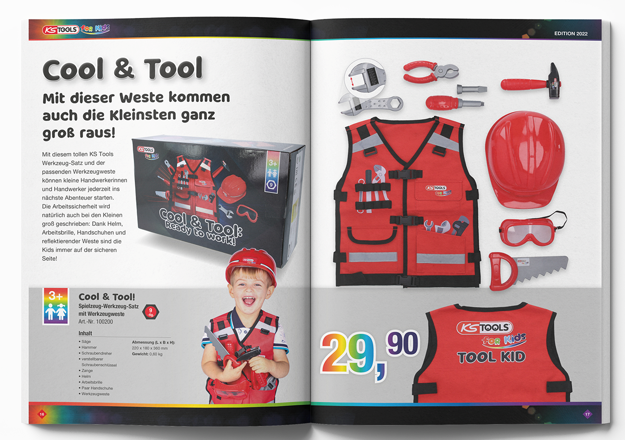 KS Tools hat für das Sortiment einen eigenen Katalog aufgelegt. „Wir möchten, dass Kinder spielerisch mit Werkzeug in Berührung kommen. Nur dann werden sie auch neugierig auf Handwerksberufe und können ihre eigene Begabung erproben,“ erklärt Orhan Altin, Geschäftsführer von KS Tools. „Kinder wollen ihren Eltern oft bei handwerklichen Arbeiten im Haushalt helfen. Das Werkzeug für Erwachsene sollten sie dabei aber nicht in die Finger bekommen. Genau dafür gibt es unser Werkzeug der Produktlinie KS Tools for Kids.“